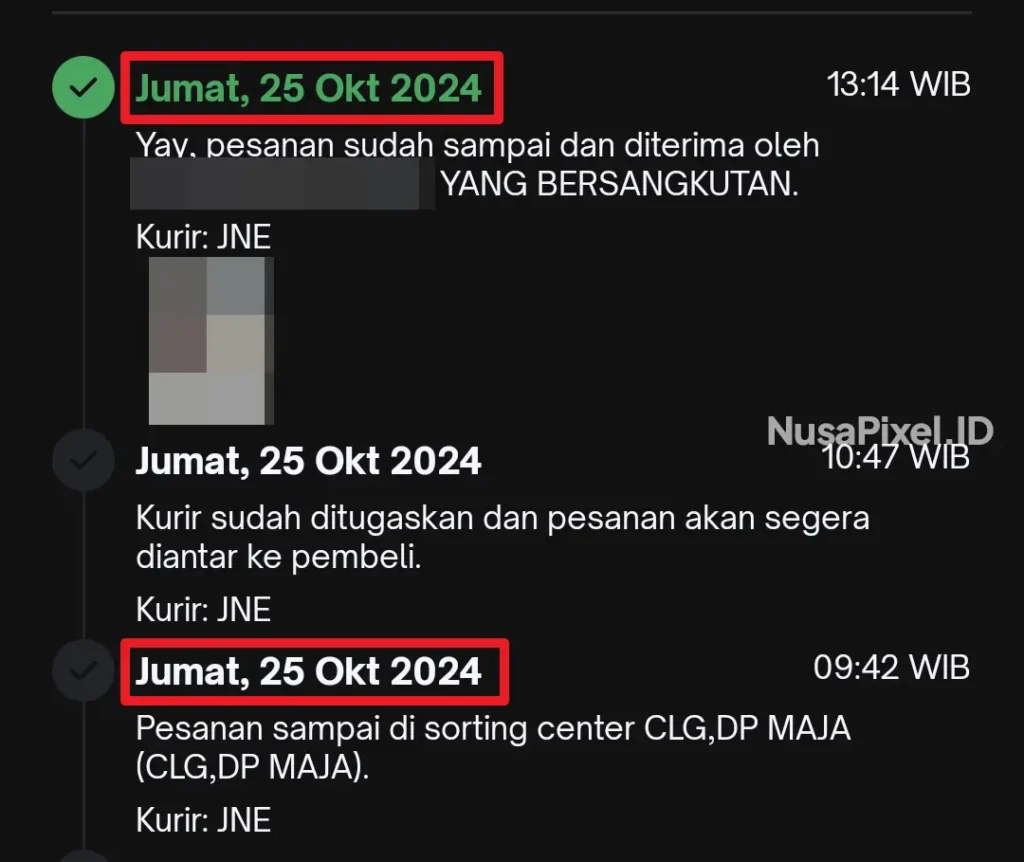 Saya sendiri menggunakan Tokopedia dan setelah paket dijemput sendiri, spontan status pesanannya sudah tiba.